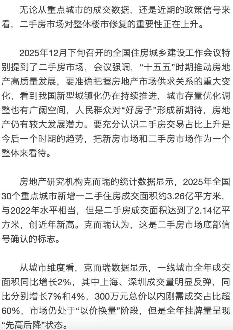 克而瑞数据显示,2025年全国30个重点城市二手房成交面积达到2.14亿平方米,成为市场修复的核心驱动力。业内分析认为,随着财政部下调房产交易增值税,2026年二手房市场成交有望在政策红利中继续回暖。