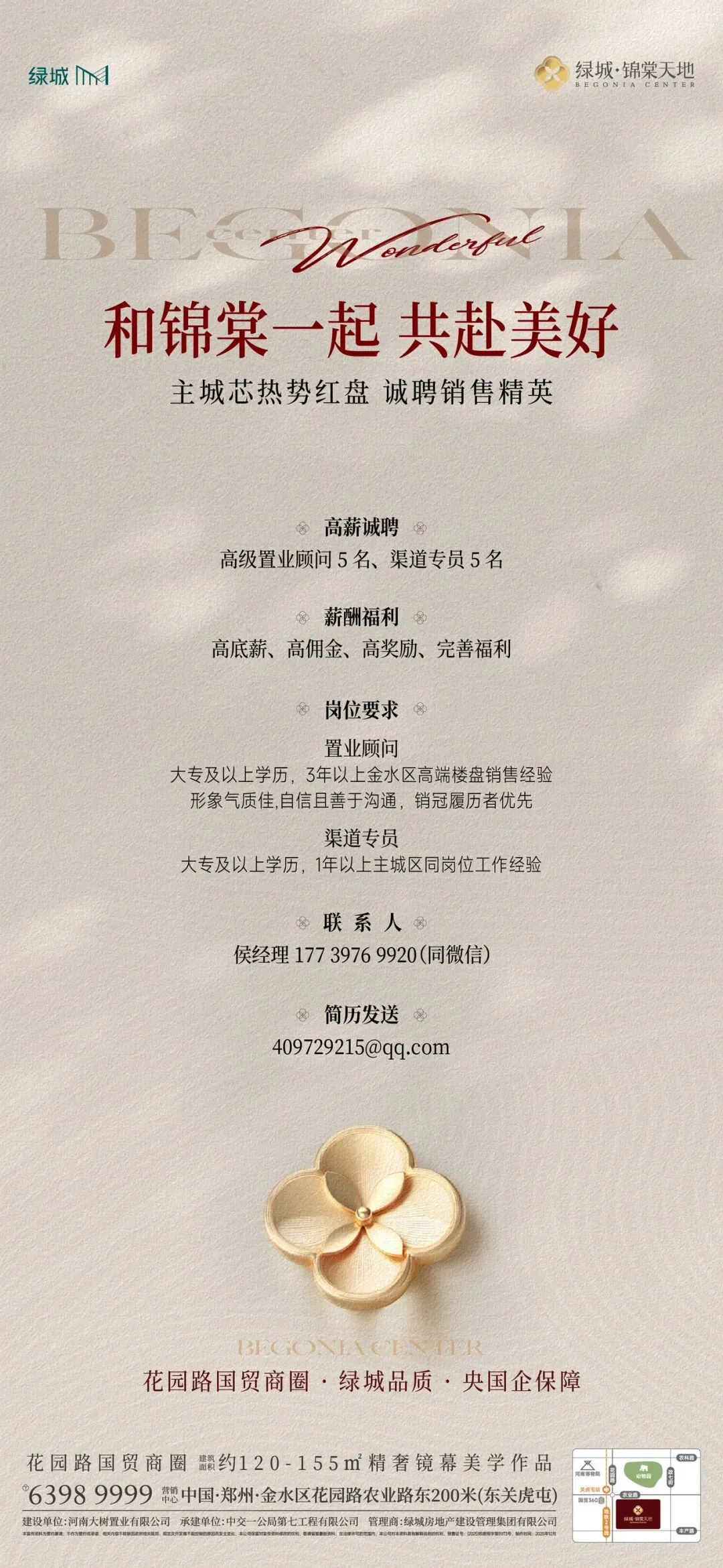 优势:高薪资、大平台、氛围nice招聘岗位:置业顾问(女)薪资待遇:无责底薪6000+福利补助900+五险一金岗位要求:身高163cm以上,形象气质较佳,有亲和力联系方式:13949010357(同微信)项目地址:郑州航空港区双鹤湖畔