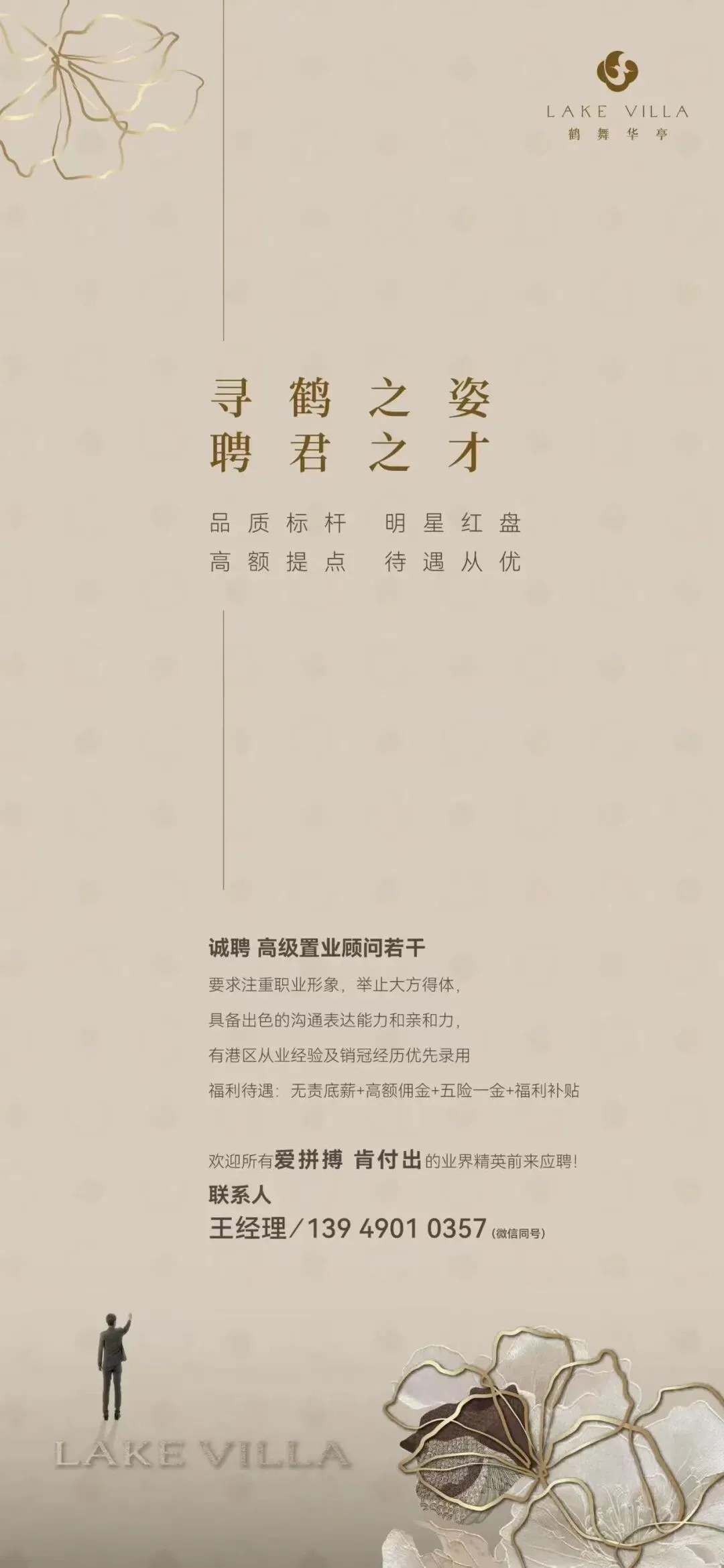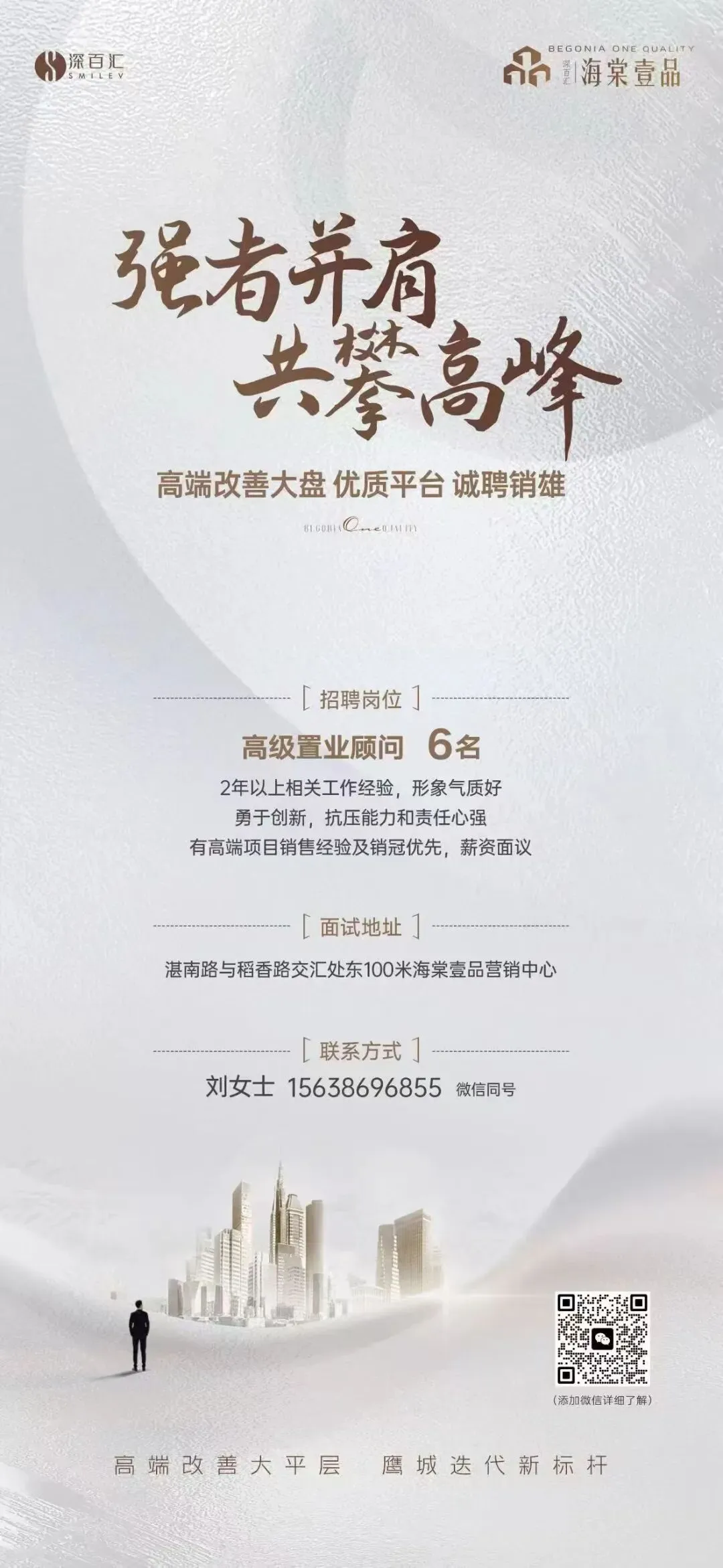 2、销售经理:3年+高端改善/豪宅案场管理经验,责任心强,擅长团队激励3、置业顾问:形象气质佳,抗压能力强,有高端产品销售经验,销冠优先4、案秘(后台):有同岗位工作经验,责任心强5、案场主播:形象好气质佳,善于表达有亲和力,有地产主播经验者优先6、签约专员