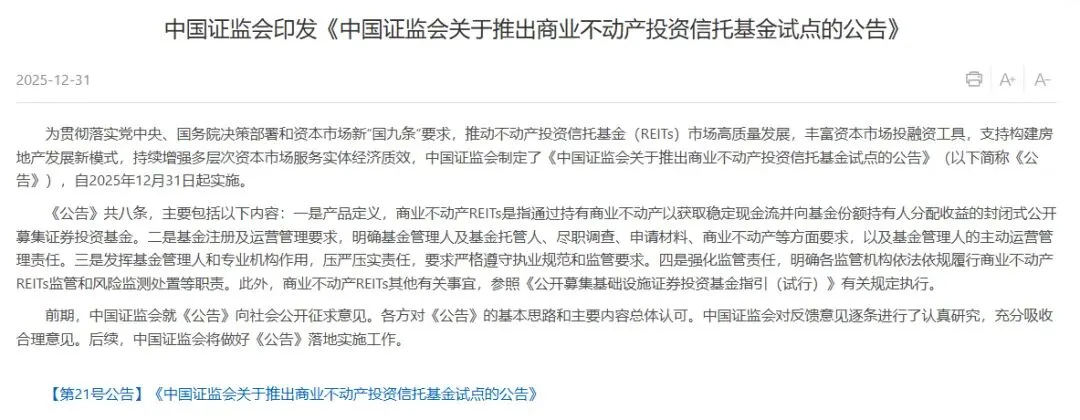 赶在2025的最后一天,证监会发布了商业不动产投资信托基金(REITs)试点规则,并即日实施。