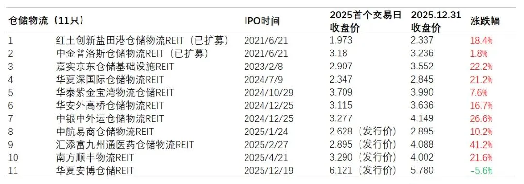 接下来就简单回顾下产业地产REITs这一年的表现吧。之前就上市的,选了今年首个交易日(2025年1月2号)的收盘价;今年新上市的,就用发行价,来跟年末最后一天的收盘价做个简单对比。1. 2025全年涨跌如何?