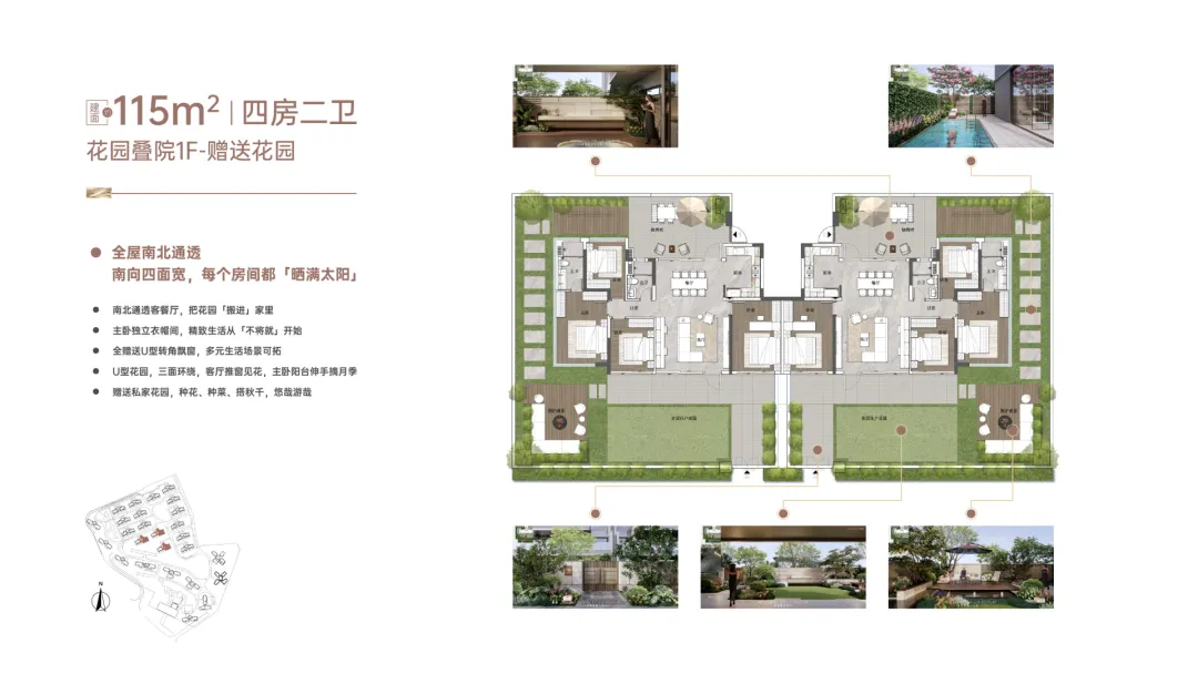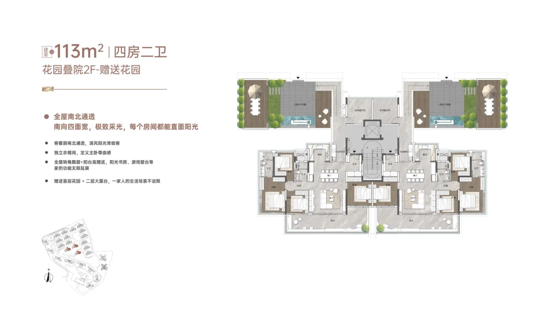 “玥境”为滨江小洋楼,主打112-130㎡低密叠院,最大亮点是超高赠送率,1F、2F户型赠送私属花园,3F赠送超大景观露台,4F复式设计,赠送顶层天台。