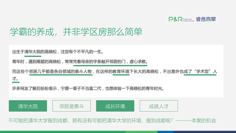 本方案旨在解决成都华润二仙桥项目在低价当道的非成熟板块实现高溢价销售的核心命题。策略上,首先重新定义区域价值,将项目所在地塑造为“东中环·人文生活策源地”,以“策展式生活”提升板块预期。其次,针对主力客群(为子女教育换房的家庭),独创“学府式成长大城”产品概念,将大学功能空间(如图书馆、实验室、礼堂)植入社区与户型,打造全国首例聚焦亲子成长与社交的住宅产品。整个营销传播围绕“为了不起的城,培养了不起的人”故事线展开,分阶段唤醒城东骄傲、展示区域新生、诠释成长价值,最终支撑价格突破区域天花板。