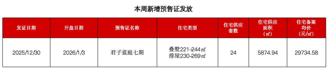 本周新预售证发放1批次,为君子蓝庭七期。供应住宅24套,面积5874.94㎡。