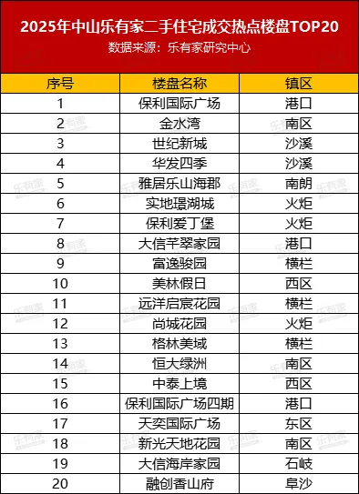 按照项目划分情况来看,2025年二手住宅成交最多的是港口保利国际广场、南区金水湾、沙溪世纪新城。