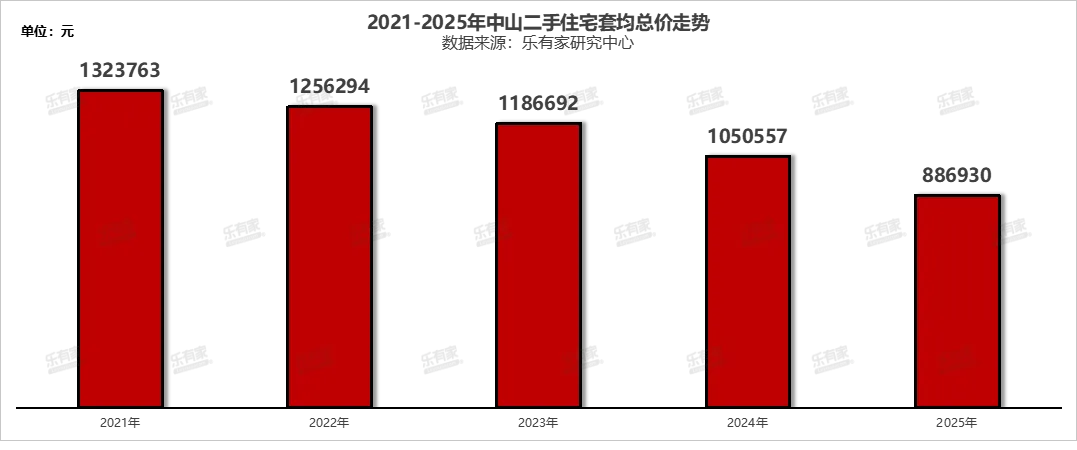 聚焦到套均总价来看,2025年中山二手住宅套均总价为886930元,同比2024年1050557元下降了15.6%。
