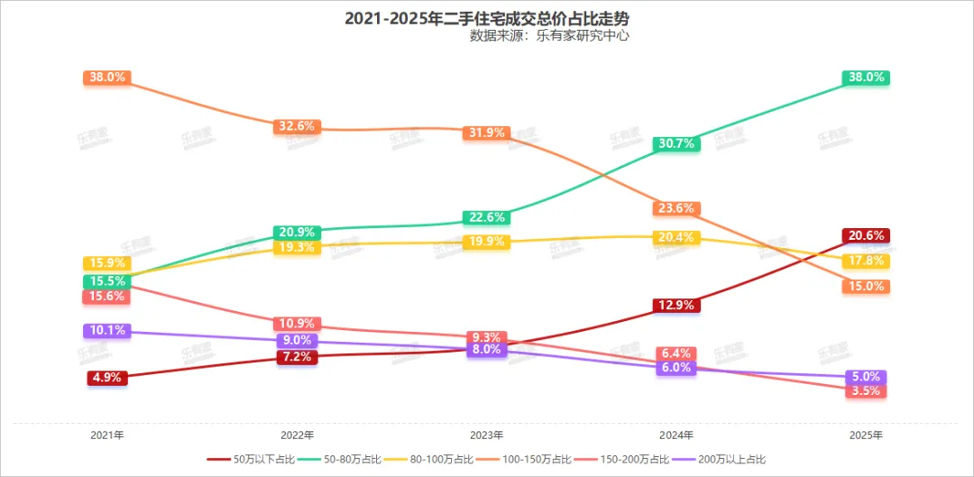 总价50-80万房源成交占比较5年前增加22.5个百分点,达38%;