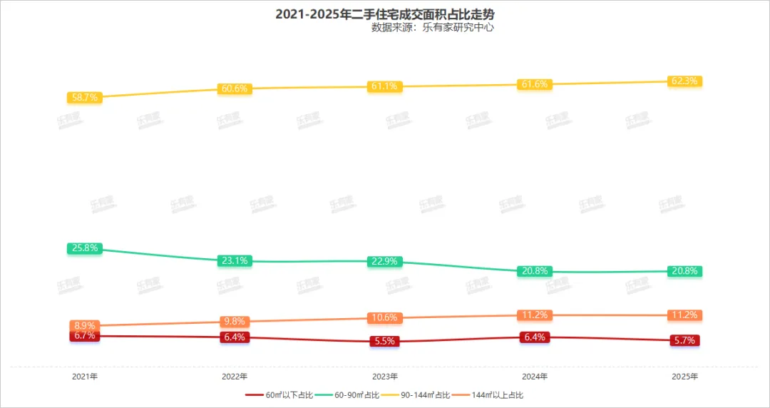 90-144㎡房源成交占比较5年前增加3.6个百分点,达62.3%,近五年稳步增长;