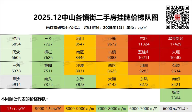 截至2025年12月,中山各镇区二手房挂牌价超过1万元/㎡的有四个镇区,分别是翠亨新区、东区、火炬开发区、五桂山。