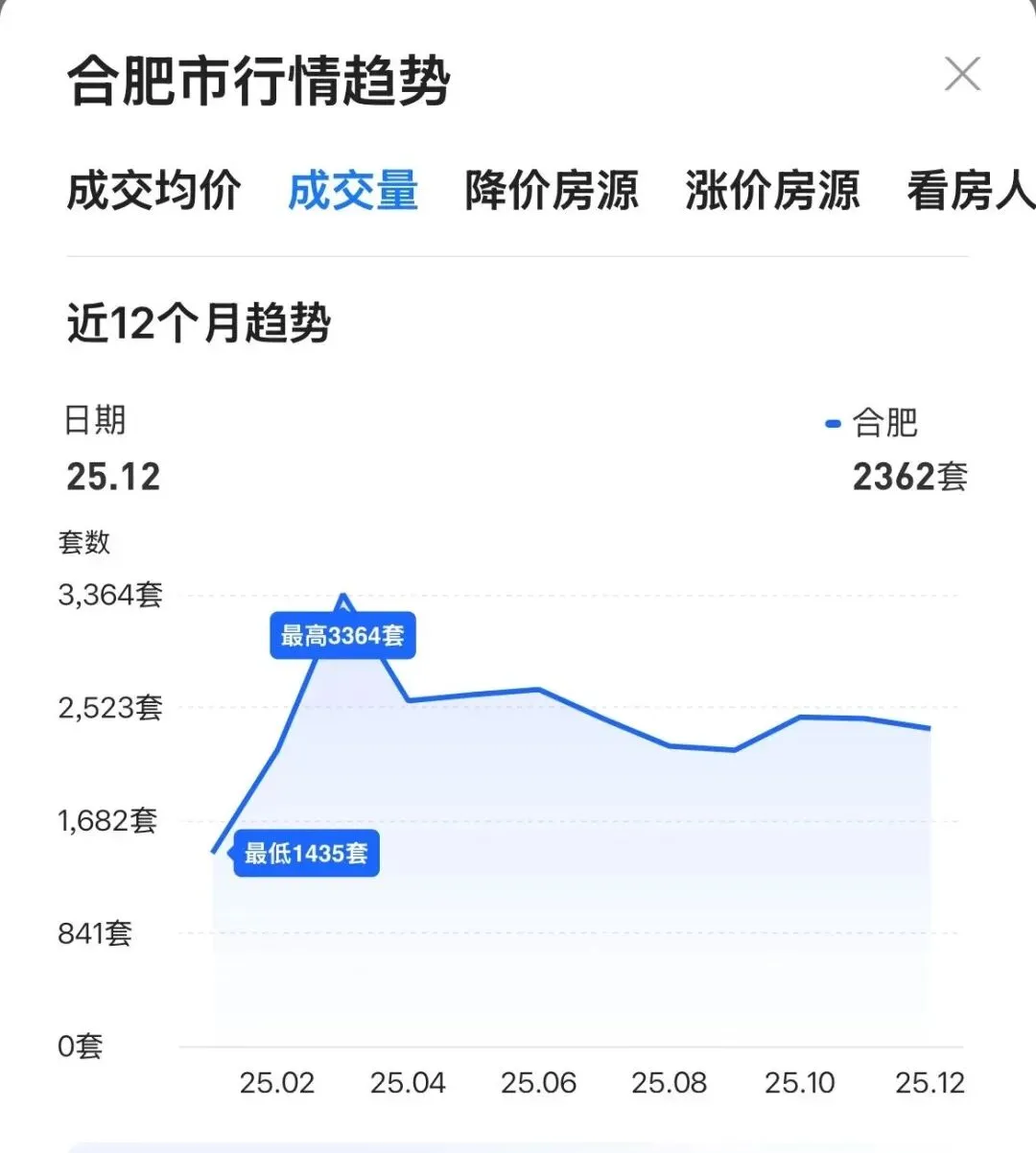 2025年合肥二手房市场呈现典型的“量涨价跌”态势。而冰山大数据显示总签约量达80033套,同比增加3657套。然而成交量的攀升未能扭转价格颓势,12月均价较1月下降19.3%,创近五年最大年度跌幅。