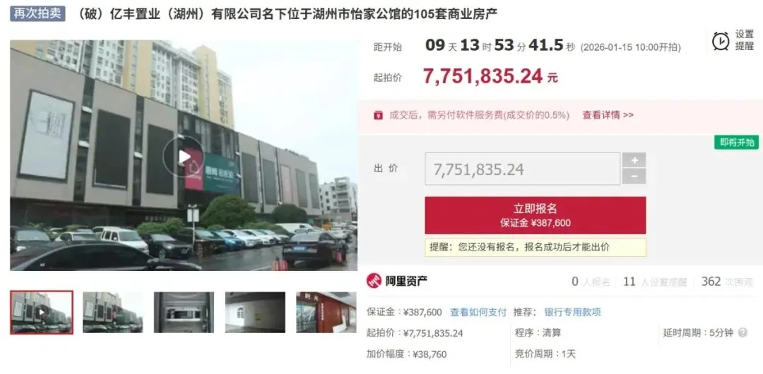 近日,湖州西南科技城怡家公馆(亿丰国际建材城)105套商业房产又一次被摆上货架。本次拍卖将于2026年1月15日开拍。