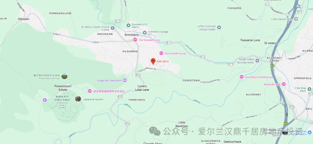 位于山脚下的 Enniskerry 村庄 社区氛围活跃,拥有各类商店、咖啡馆、餐厅及体育俱乐部。交通条件优越,可通过 N11 公路直达都柏林市中心,车程约 30 分钟。都柏林公交 44 路 服务 Enniskerry 村,而约 15 分钟车程 外的 Bray 则提供 DART 铁路服务,通勤进城十分便利。邻近区域还包括 Greystones、Delgany、Shankill、Carrickmines 及 Foxrock,生活与教育配套成熟完善。