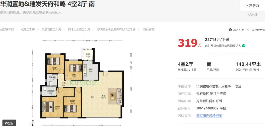 2026年01月05日,据市场端消息:成都天府新区鹤林村,华润建发天府和鸣建面140平套四报价319万;目前房东心里价在319万愿意出售。