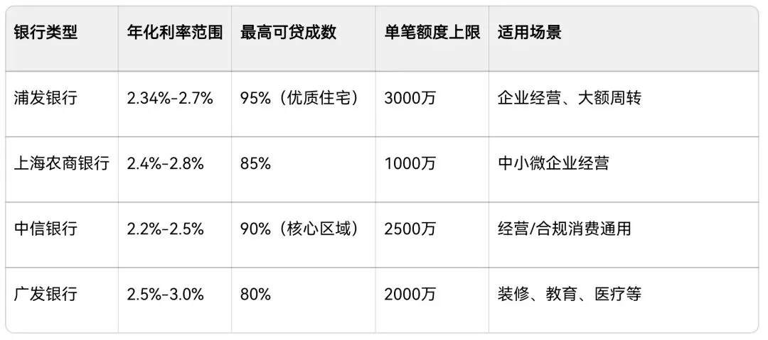 上海70年产权住宅、别墅均可,商用房需产权清晰,评估值≥200万更易批核;