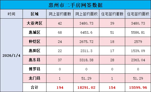 大亚湾区网签21套,面积1859.3㎡;惠城区62套,9213.26㎡;仲恺区14套,1214.3㎡;惠阳区15套,1163.73㎡;惠东县7套,572.61㎡;博罗县21套,1273.5㎡;龙门县11套,2296.38㎡。合计151套,17593.08㎡。