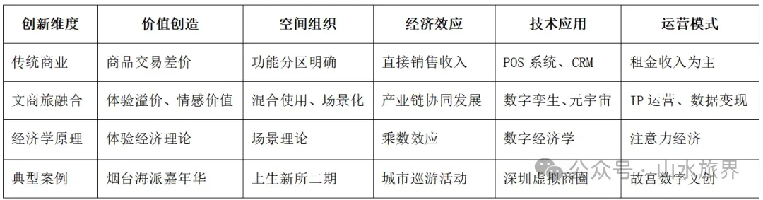 面对需求侧的深刻变革,商业空间的供给侧也经历了根本性的创新与重构。文商旅融合并非简单的业态叠加,而是基于体验经济、场景理论和乘数效应的系统性改变。这种创新不仅改变了商业空间的外在形式,更重塑了其价值和运营方式。通过分析供给侧的关键创新,可以更好理解文商旅融合成为趋势的原因。