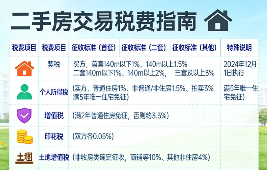 二手房交易税费是指在二手房交易中,税务部门向买卖双方征收的各类税费,在二手房交易税费包括: