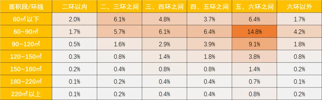 而这些二手房主要分布在主城区,2环-5环之间各环线占比10%,相对均衡;5-6环之间占比较为突出,约21%,其中: