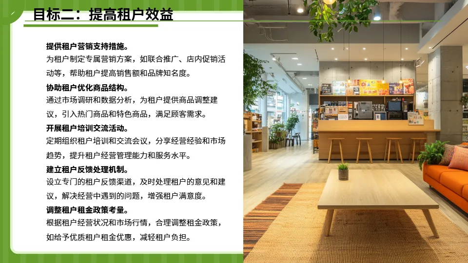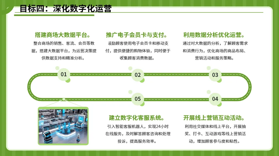 搭建商场数字化运营管理平台,整合客流监测、销售分析、商户管理、会员运营等功能模块,实现运营数据实时可视化;引入线上营销工具,搭建商场小程序商城,开展线上直播带货、优惠券发放等活动,实现线上线下客流互通、销售联动;建立会员数字化管理体系,通过数据分析精准洞察会员需求,提供个性化服务和营销推送。(二)深化业态优化升级