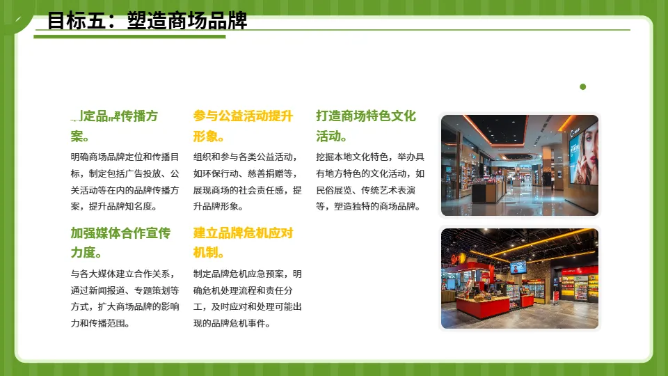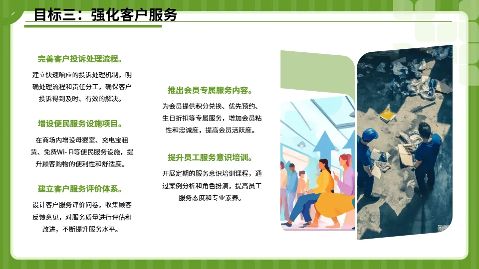 摒弃同质化营销思路,围绕年轻消费群体和家庭消费群体,策划具有独特性的主题活动;加强异业合作,联合周边影院、健身房、亲子机构等开展跨界营销,实现资源共享;深化会员营销,推出会员专属权益日、积分兑换新玩法等,提升会员粘性和消费频次;结合节日节点和消费热点,打造原创IP活动,提升商场的知名度和影响力。(四)强化团队建设与服务升级