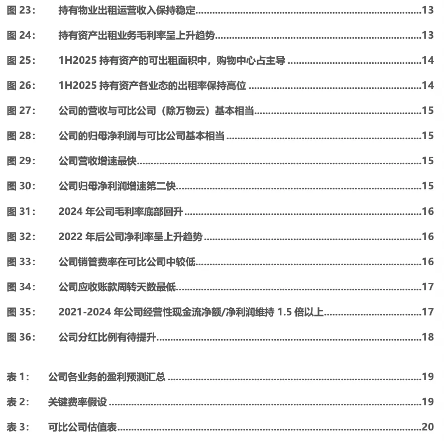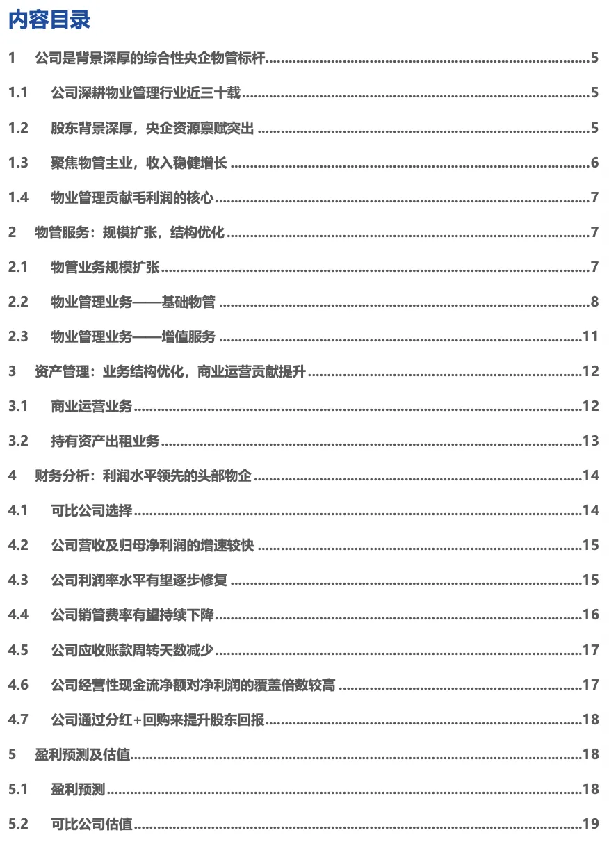 可比公司选择同样在A股上市,且主营业务同为物业管理服务的南都物业、新大正、特发服务作为可比公司,可比公司2025年PE的中位数为22.1x。我们认为公司作为央企物管公司,内生外拓并举,业绩韧性强,能够实现稳健增长,同时后续分红比例有望逐步提升。首次覆盖,给予“买入”评级。(1)宏观经济风险:若宏观经济表现承压,将可能拖累地产销售表现,进而影响项目竣工后交付公司管理的规模,同时还会影响公司的收缴率。