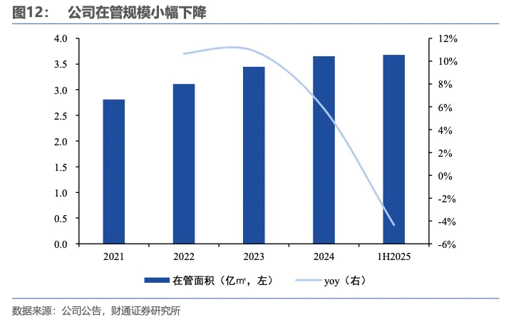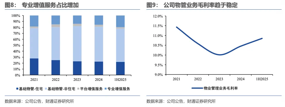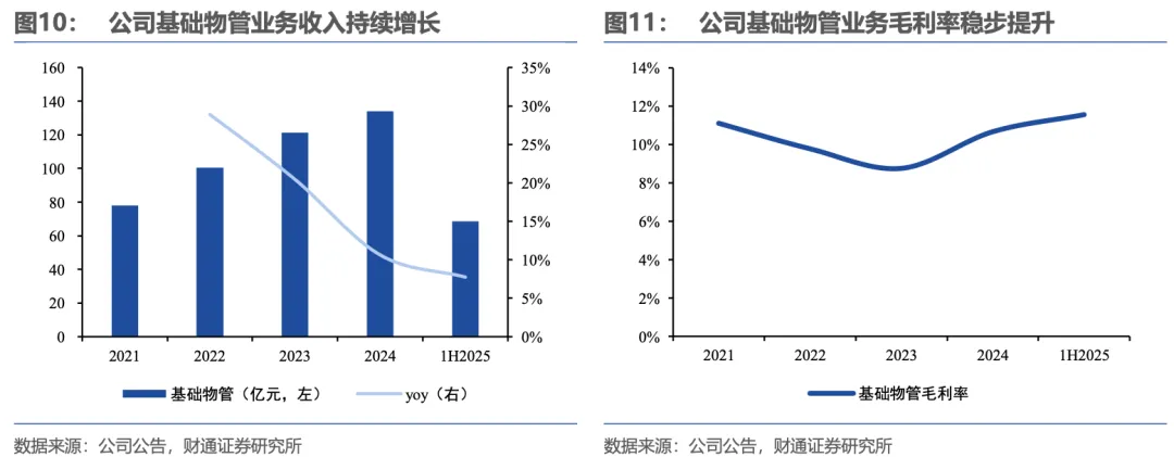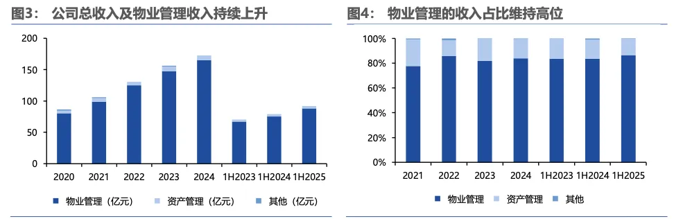 公司持续聚焦物业管理主业,商业运营贡献新动能:2025年上半年,公司物业管理服务收入88亿元,同比+16.8%,收入占比达96.6%;公司商业运营业务在管项目72个,收入0.9亿元,同比+30.7%,拉高整体资产管理业务增速,随着后续商业运营项目数量的增长,未来有望贡献新动能。