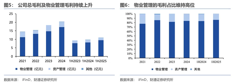 公司总收入及物业管理收入维持增长。2025年上半年,公司实现总收入91.07亿元,同比+16.2%,其中物业管理服务收入达88.00亿元,同比+16.8%。物业管理收入占总收入比重高达96.6%,2024全年占比为96.0%,1H2024占比为96.1%,是公司绝对核心的收入来源。物业管理服务收入占比持续提高,是公司业绩的压舱石。自2020年以来,公司物业管理服务收入占比始终稳定在93%以上,且整体呈现稳步提升趋势,从2020年的93.1%提升至2025年上半年的96.6%。1.4 物业管理贡献毛利润的核心