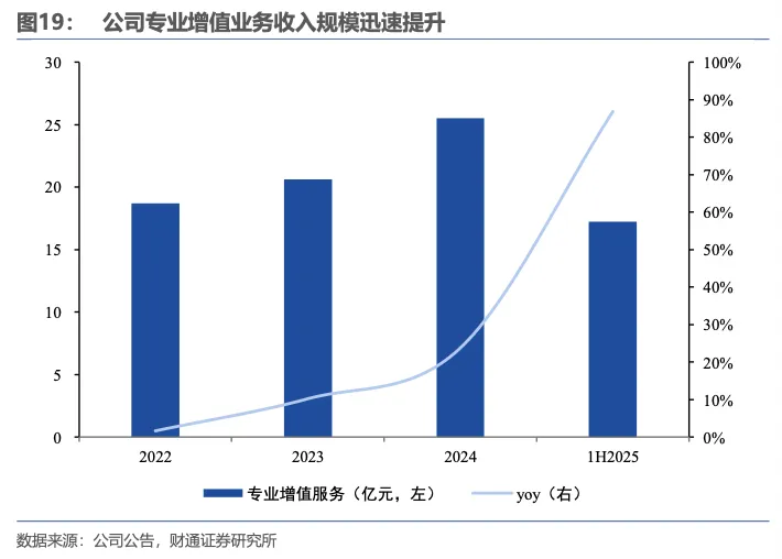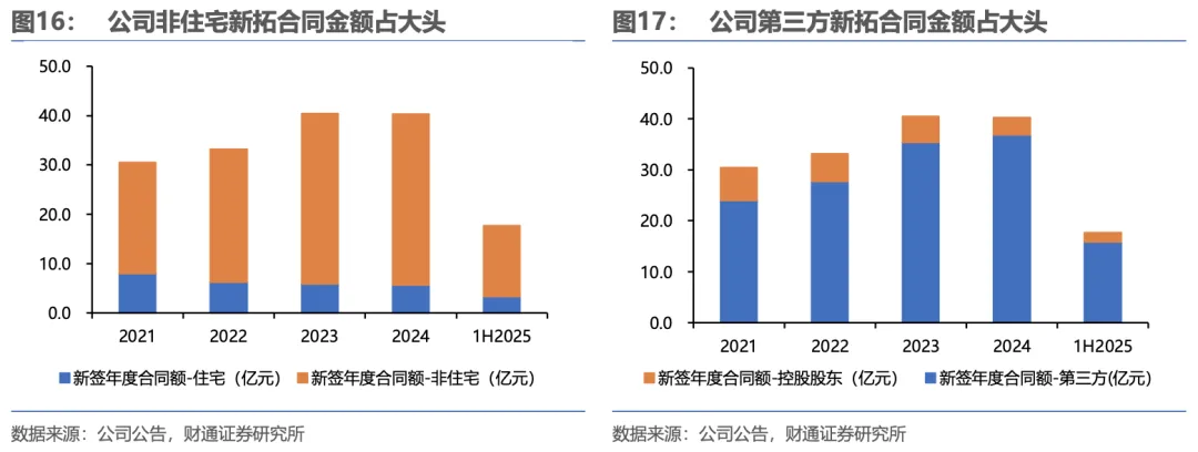 公司基础物管业务收入持续增长,盈利质量企稳回升。基础物管业务呈现缓慢增长的态势,营收从78.0亿元逐步提升至134.0亿元,同时,业务增速持续放缓,同比增长率从28.89%逐步下降至7.75%。同时,毛利率经历了一段下降后有所回升,从早期11.11%一度降至8.76%,最终恢复至11.56%,整体来看,该业务在规模扩张阶段面临增长动力逐步减弱,近期虽营收收缩,但盈利质量呈现企稳回升迹象。在管规模具备韧性,住宅项目及关联方项目面积占比提升。2022-2024年公司在管面积复合增速为8%。受行业持续下行影响,1H2025公司在管面积为3.7亿平方米,同比小幅-4.3%,具备较强韧性。在管项目中,住宅项目及关联方项目面积占比提升。1H2025公司住宅项目在管面积占比提升3.9pct至38.3%,关联方项目在管面积占比提升2.0pct至35.3%。受地产行业持续深度调整,物业外拓市场竞争加剧,1H2025公司新签年度合同金额17.6亿元,同比下降6.8%。公司持续发力第三方外拓以及非住宅外拓,2021年至2025年上半年公司第三方新拓年度合同额占比由不足80%稳步上升至90%以上;公司非住宅新拓年度合同额占比由70%左右稳步上升至80%以上。2.3物业管理业务——增值服务