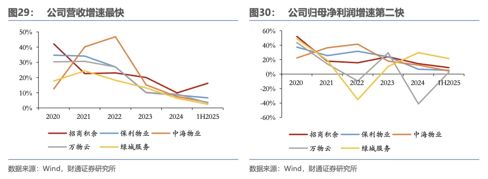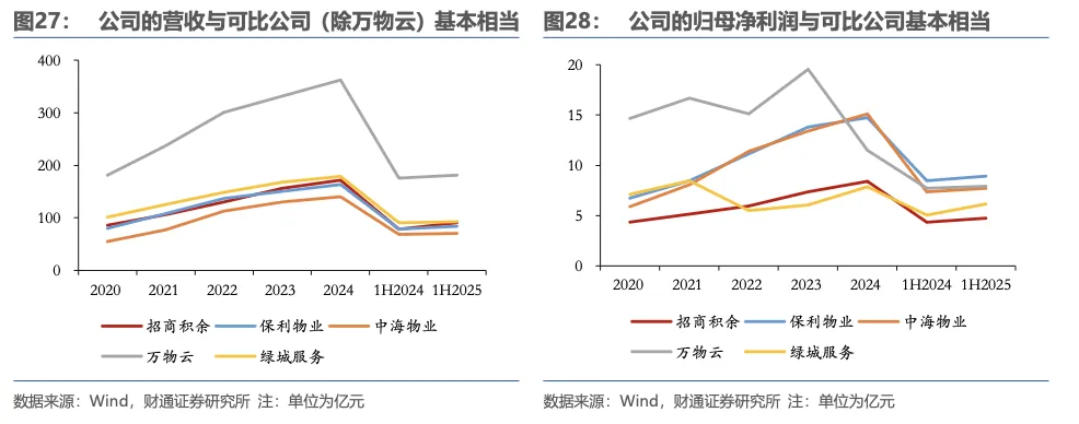我们选择保利物业、中海物业、万物云、绿城服务共四家公司作为可比公司。可比公司同样是深耕物管赛道、经营稳健的行业头部公司,除万物云外,其他公司的营收、归母净利润体量与公司基本相当。4.2公司营收及归母净利润的增速较快
