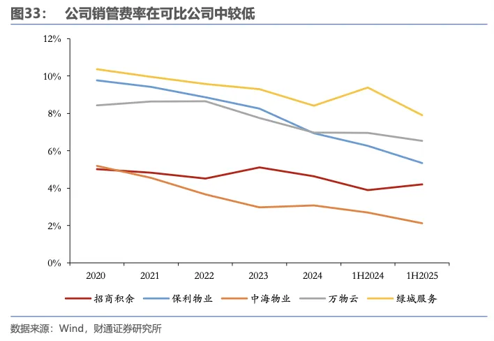 公司总毛利润及物业管理毛利维持增长。2025年上半年,公司实现毛利总额11.04亿元,同比+15.9%,其中物业管理业务贡献毛利9.55亿元,占总毛利比重达86.5%,同比+12.0%。