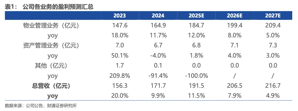 我们假设物业管理服务内生外拓动能强劲,能够随着规模扩张实现稳健增长,2025-2027年收入同比增速分别为12.0%、8.0%、5.0%。资产管理业务(商业运营、持有物业出租及经营)稳步发展,但2025年受大环境影响表现承压,2025-2027年收入同比增速分别为1.8%、4.0%、3.0%。其他业务是剩余不动产处置业务,体量较小,预期2025-2026年完成剥离。根据上文对三项主要业务的预测,预计公司2025-2027年总营收分别为191.5亿元、206.5亿元、216.7亿元,同比增速分别为+11.5%、+7.9%、+4.9%。公司采取降本增效等措施,随着收入的增长,预计管理费用率及研发费用率将逐步下降,预计2025-2027管理费用率分别为3.10%、2.85%、2.70%;预计2025-2027研发费用率分别为0.40%、0.35%、0.30%。销售费用率受行业竞争激烈及公司专业服务拓展的影响,预期销售费用绝对额上升,其增速与收入增速同步,预计2025-2027销售费用率维持0.70%。5.1可比公司估值