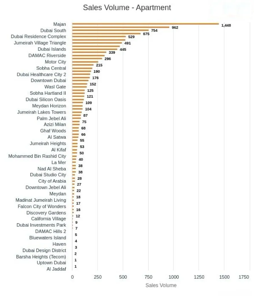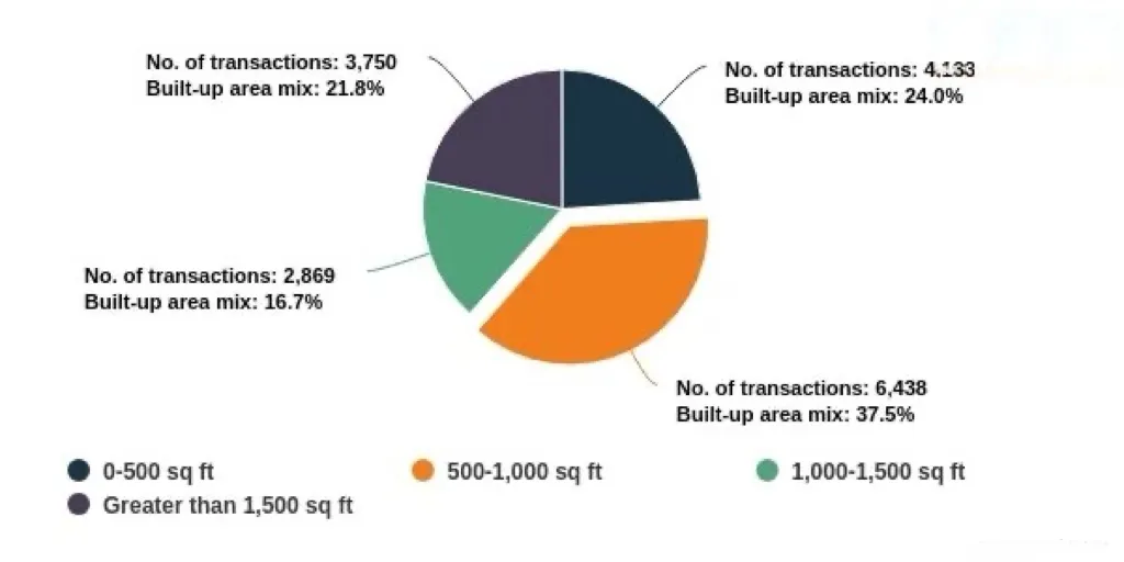 ▲ 2025年12月迪拜房产不同建筑面积销售量占比图(eg:500-1000平方英尺及以上的房产交易量6438,占比37.5%)