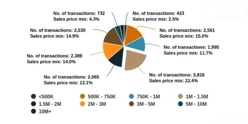 ▲ 2025年12月迪拜各销售价格区间占比图(eg:1-1.5百万迪拉姆的房产交易量3816套,占比22.4%)