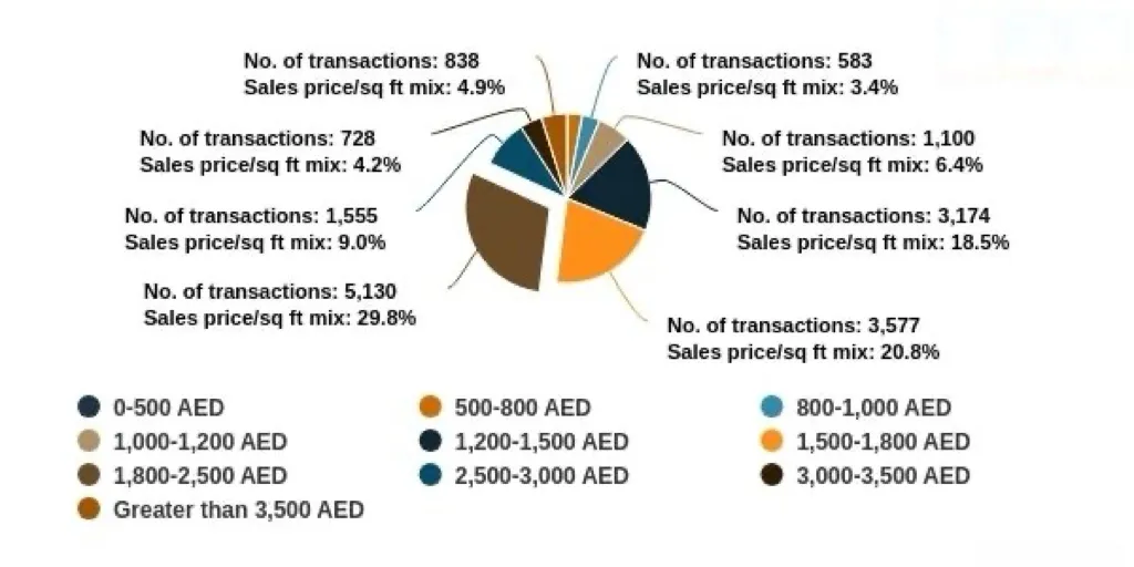 ▲ 2025年12月迪拜房产各销售价格区间/sq.ft的销售量分布图(eg:1800-2500AED的房产交易量5130套,占比29.8%)