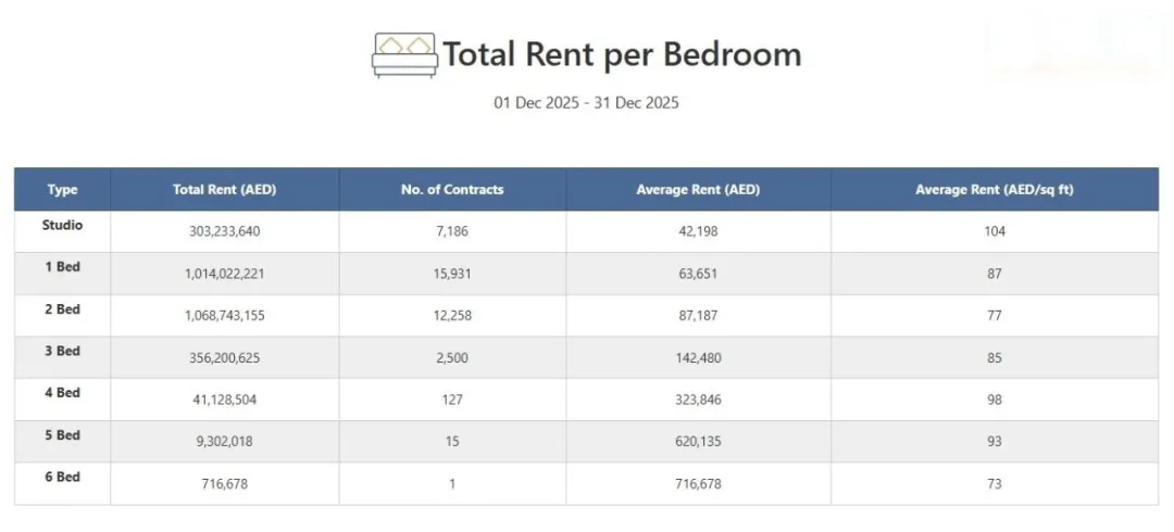 ▲2025年12月迪拜【公寓】各居室类型租赁数据汇总