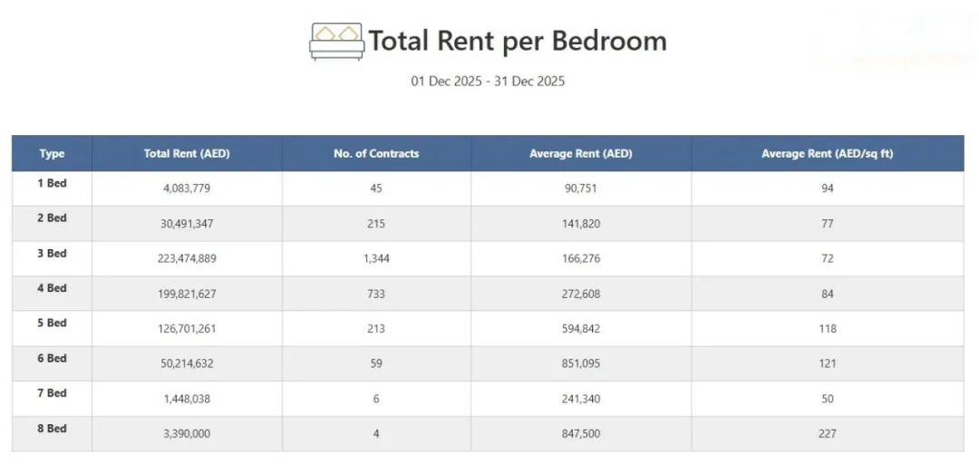 ▲2025年12月迪拜【别墅】各居室类型租赁数据汇总