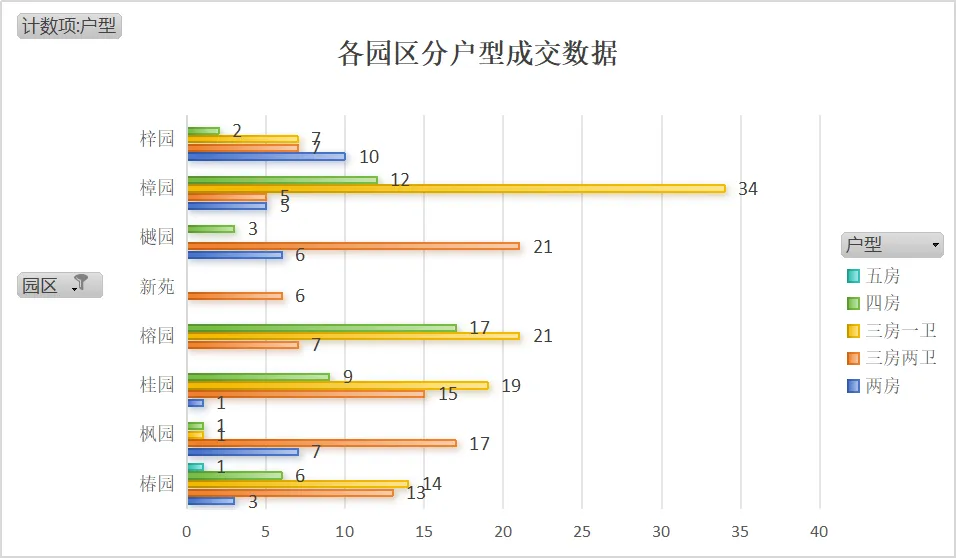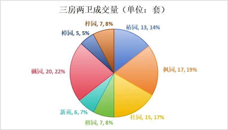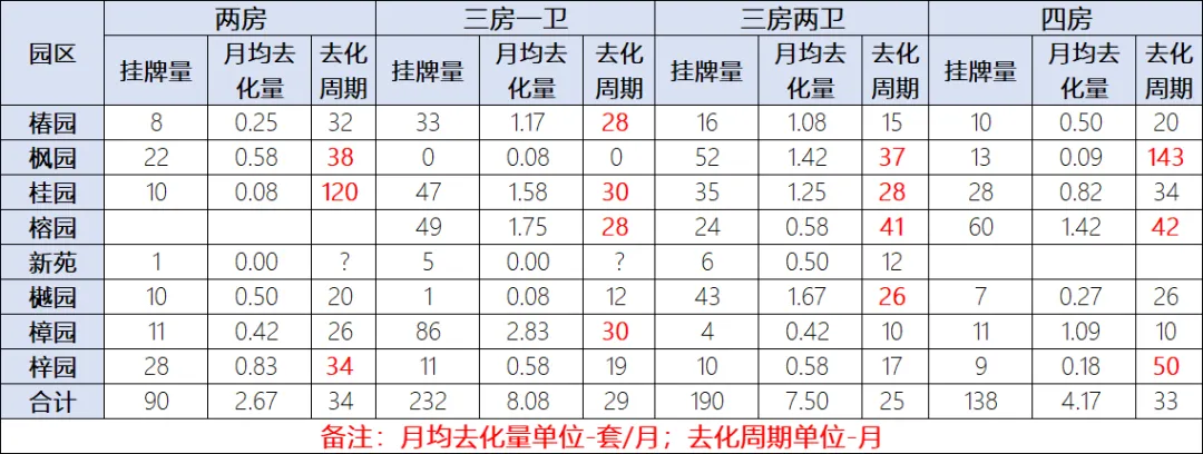 ③三房两卫整体挂牌190套,占比29%,去化周期25个月,其中去化压力主要集中在:榕园挂牌24套-去化周期41个月,枫园挂牌52套-去化周期37个月,桂园挂牌35套-去化周期28个月,樾园挂牌43套-去化周期26个月;