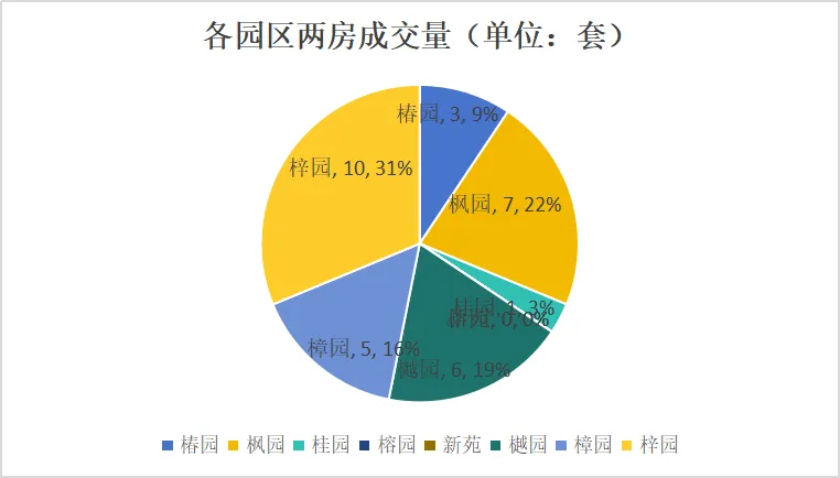 ①两房户型整体挂牌合计90套,占比14%,去化周期34个月,其中:桂园、枫园、梓园、椿园持有业主需及时关注市场,避免长期挂牌;整体两房非市场主流户型,去化压力偏大,如遇合适客户出价,可选择面谈;