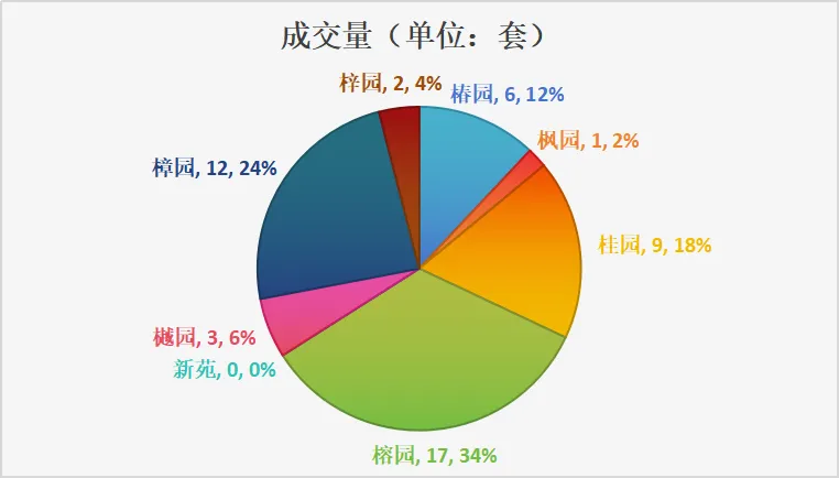 桂园、樟园、榕园合计成交145套,总占比达54%,是绿都澜湾的主力成交园区;其中樟园成交56套,占比约21%,榕园成交45套,占比17%,桂园成交44套,占比16%。