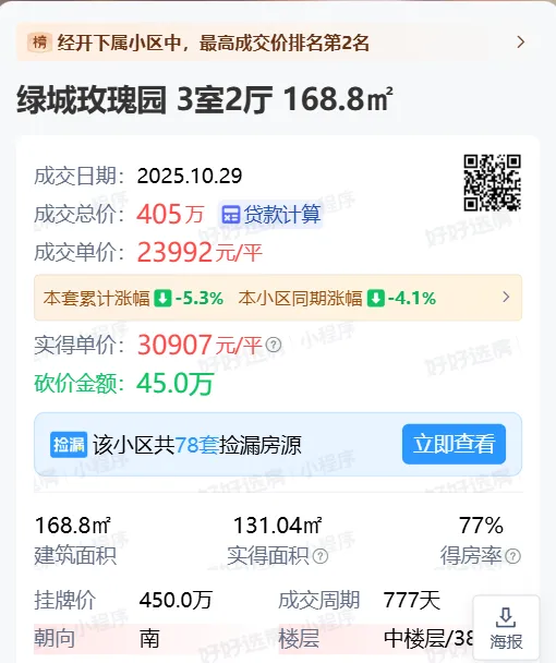 经开区天花板绿城玫瑰园,大户型成交价也只在