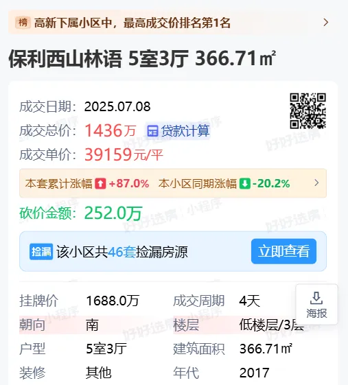 高新区只有保利西山林语这种老牌别墅,成交价还能稳定