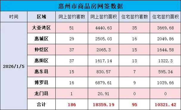 大亚湾区网签51套,面积4440.63㎡;惠城区29套,2505.03㎡;仲恺区37套,2065.3㎡;惠阳区37套,1617.14㎡;惠东县15套,830.57㎡;博罗县16套,6879.61㎡;龙门县1套,20.91㎡。合计186套,18359.19㎡。