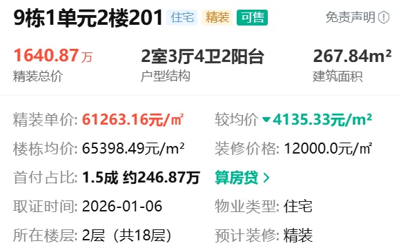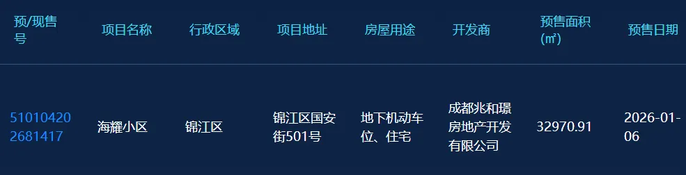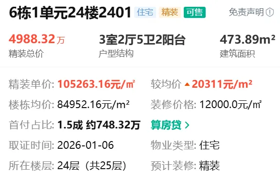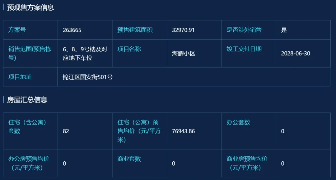 成都建发海耀6、8、9号楼,已于2026年01月06日取得预售许可证(预售许可证号:蓉预售字510104202681417)。本批次供应82套70年产权住宅,建面268-474平米,单价¥61263-105263元/㎡,总价¥1640.87-4988.32万,装修标准¥12000元/㎡,均价¥76943.86元/㎡。
