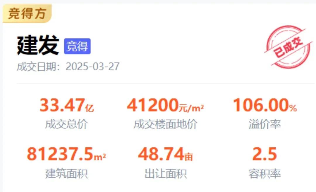 2025年03月27日,成都新地王诞生;建发竞得锦江区金融城三期第三宗住宅用地(H10地块),成交总价约33.47亿楼面价41200元/㎡,213轮竞价溢价率106%,这是成都土拍成交楼面价首次突破4万元/㎡,成为成都最新单价地王!