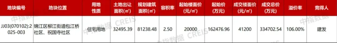 编号JJ03(070102):2025-003,地块位于锦江区柳江街道包江桥社区、祝国寺社区,用地性质为住宅用地,土地出让面积32495.39㎡(合48.7431亩),规划建筑面积81238.48㎡,容积率2.5,起拍楼面价20000元/㎡,折合起始价约16.25亿元。该地块吸引了远达、成都交子金空、仁和、华发、锦江统建&金茂、华润置地、中海、建发、中旅、招商蛇口共10家企业参拍(仅仁和春天和远达两家民企),最终建发以楼面价41200元/㎡竞得该地块,成交总价约33.47亿元,溢价率106%!