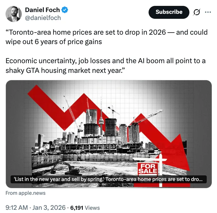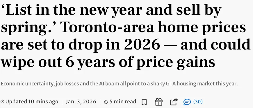 加拿大两家大型房地产公司Royal LePage和Re/Max Canada预测都预测,多伦多房地产市场的价格将持续下跌至2026年底。