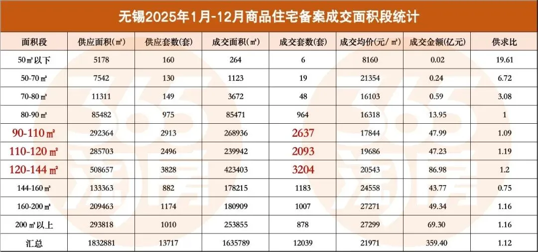 另外,12月新房备案成交面积段在成交套数中占比,建面约120~144㎡占比最高,约26%,其次是建面约90~110㎡,占比约为23.36%,建面约110~120㎡占比约为18.69%。2025年1月-12月新房备案成交总套数为12039套,同比去年下降了25.85%。2021年到2025年,近5年新房备案成交金额、成交均价、成交套数均为最低,整体成L型发展,除2021年,近4年比较平稳。年中6月为本年度成交套数最高月份,为1214套,从备案数据来看,3、4、5月也是符合昔日“小阳春”的特点。9月、10月在政策和长假的激励下也有起色,12月则是在年底冲刺下取得的成绩。经开成交金额和成交均价皆排第一,成交金额为94.91亿元,成交均价为28660元/㎡;梁溪区、滨湖区虽然成交套数不多,但项目大多是高改类型,年度总成交金额分别为61.83亿元、62.99亿元;2025全年度备案成交面积段,依然是建面约120~144㎡的户型成交套数最高,占比为26.61%。其中,华发中央首府排列第一,成交612套,成交均价为23973元/㎡,套均总价约313万;大华锦绣前城成交386套,成交均价在16529元/㎡,套均总价约181万;中信·云上都会排列第三,备案成交为369套,成交均价为13719元/㎡,套均总价约为144万。2025新房市场两极分化,有卖得特别好的,也有无人问津的,同质化楼盘的压力变大,差异化的“好房子”才是出路。2026年还有一批将要亮相的纯新项目,容积率低于1.5(含1.5)的项目就有16个,四代住宅也会陆续上新,值得期待,大家预测一下哪个项目卖得最好?2025年,无锡二手房成交套数为40860套,同比去年下降了6.67%,是新房备案成交的2.39倍。