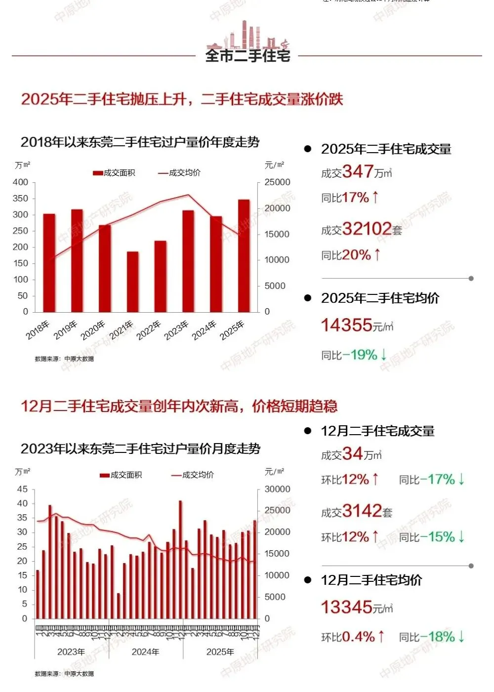 与新房市场的收缩形成鲜明反差的,是二手房市场的显著升温。2025年,东莞二手住宅成交面积达347万㎡,同比逆势增长17%,成交量超过3.2万套。这股暖流主要源于价格的大幅回调。全年二手房均价降至每平方米1.4万余元,同比下跌19%,与新房形成了显著的价差。