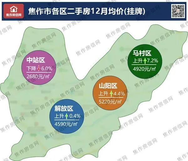 12月份中站区挂牌均价约2680元/㎡,解放区约4590元/㎡,山阳区约5220元/㎡,马村区约4920元/㎡,中站区较上月比有所下降,解放区、山阳区、马村区较上月比均有所上升。