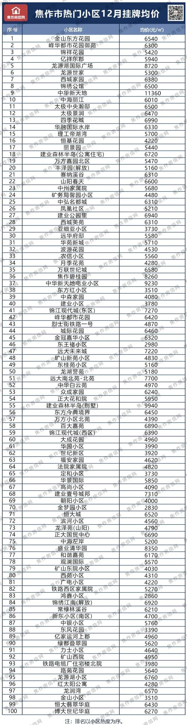 最后,来看一下12月焦作热门二手房挂牌均价,看看你家小区的房价涨了多少!